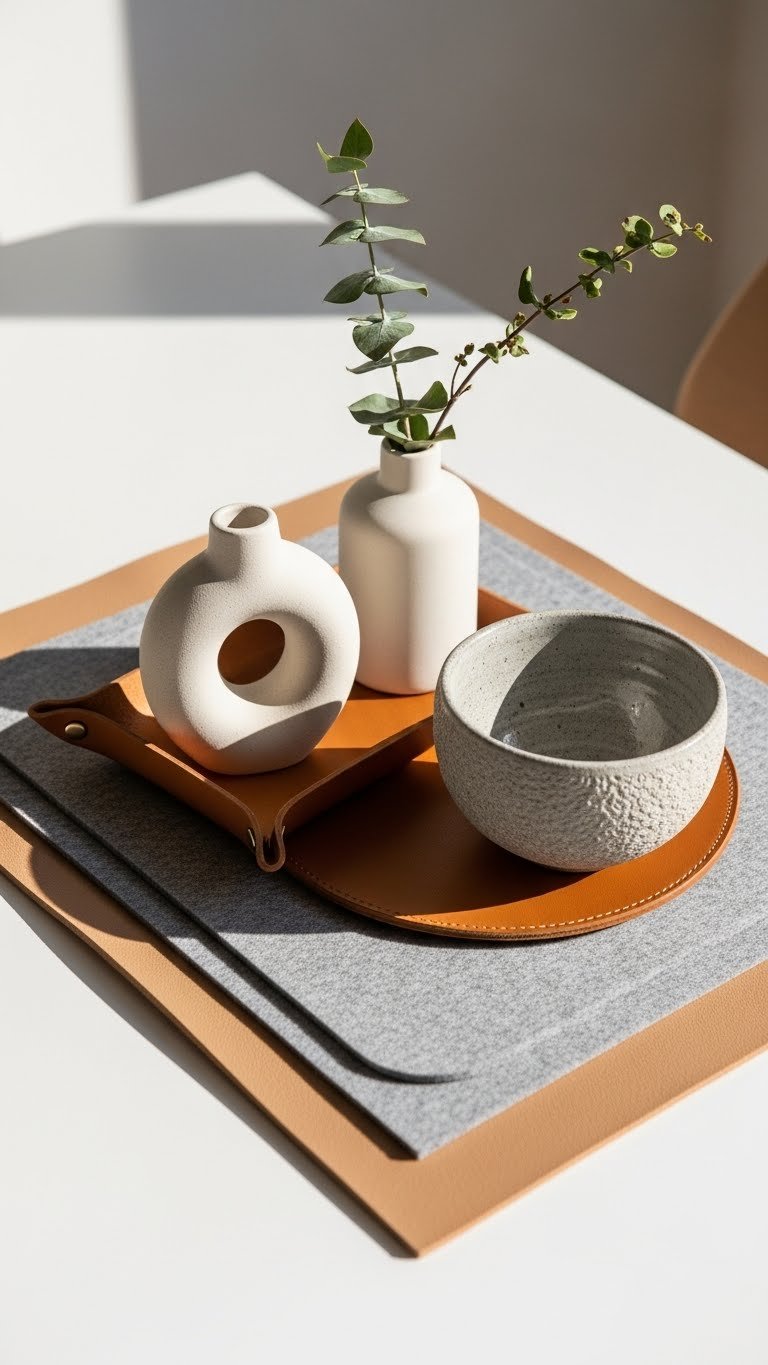 After you’ve layered leather and felt for tactile richness, pare down surfaces so each object reads clearly.