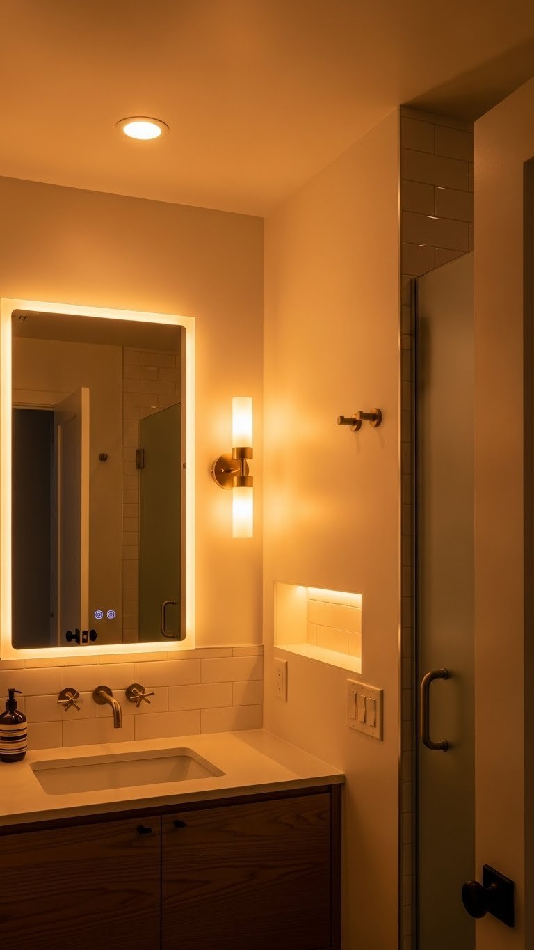 Because lighting shapes mood as much as function, layer warm LEDs with dimmers to give your small bathroom flexibility—from bright, task-ready light for grooming to soft, spa-like glow for winding down. You’ll mix overhead, vanity, and accent sources to control mood lighting, use amber LEDs for warmth, and dial intensity to suit tasks or relaxation—simple, freeing, and distinctly upscale.