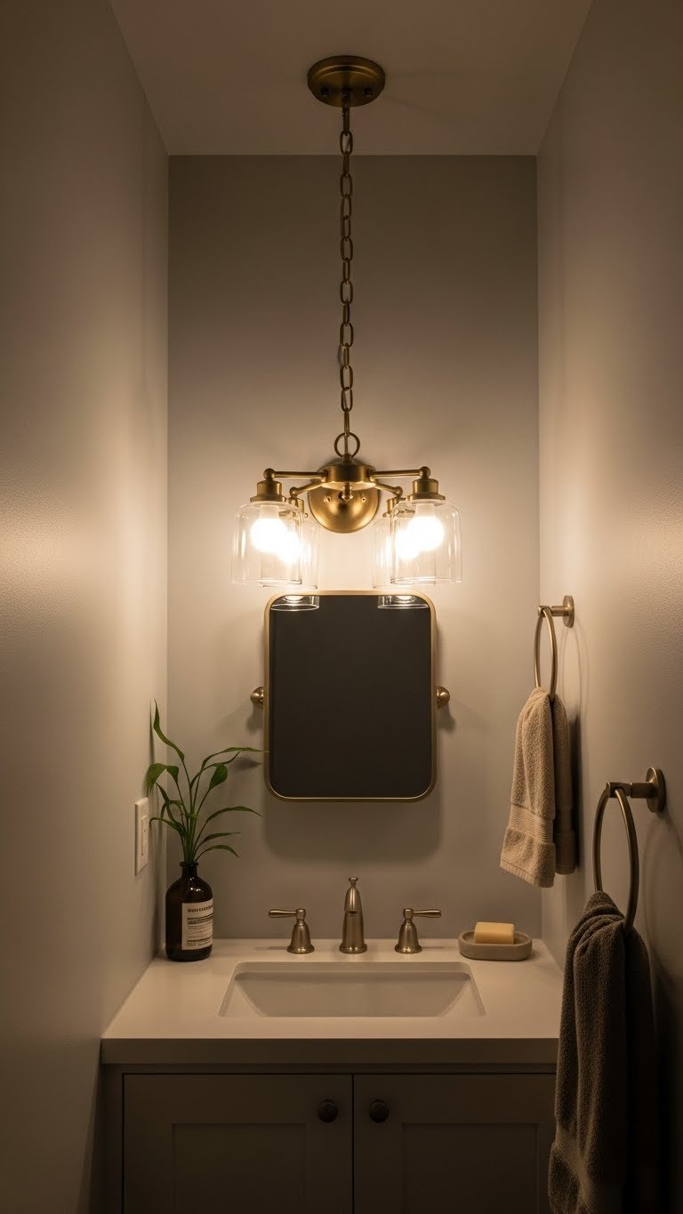 Looking for a focal point that feels luxe without overwhelming tight quarters? Pick a compact pendant or small chandelier with clean lines that reflects your taste. Adjust chain length to sit above the vanity or center without crowding. Use dimmable bulbs for mood control and energy savings. You’ll transform the room into a liberated, boutique-feel space that still breathes and functions well.