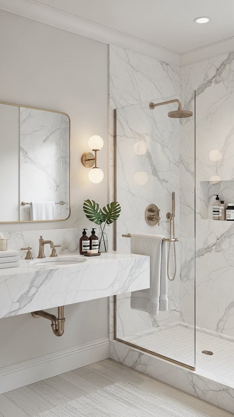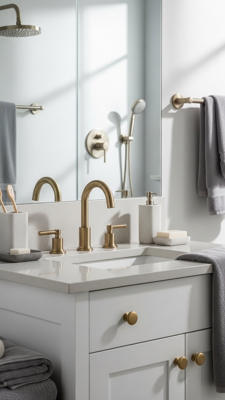 Choose Matte Brass for warmth or Satin Nickel for modern restraint, then replace handles, shower fittings, and lighting accents to match. You’ll free the space visually, feel intentional, and enjoy a luxe, calm bath without fuss.