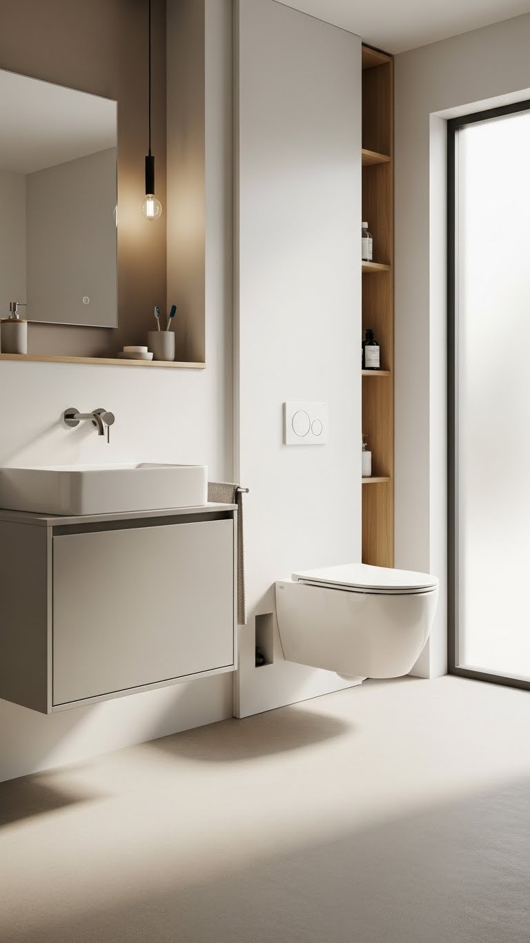 Mount a wall-hung vanity and toilet to free up floor space and create an immediate sense of airiness in a small bathroom. You’ll enjoy a cleaner, modern profile with a compact basin and a concealed floating cistern. Choose slim cabinetry, durable finishes, and easy-access plumbing panels so you can keep things minimalist, functional, and liberating without sacrificing comfort or style.
