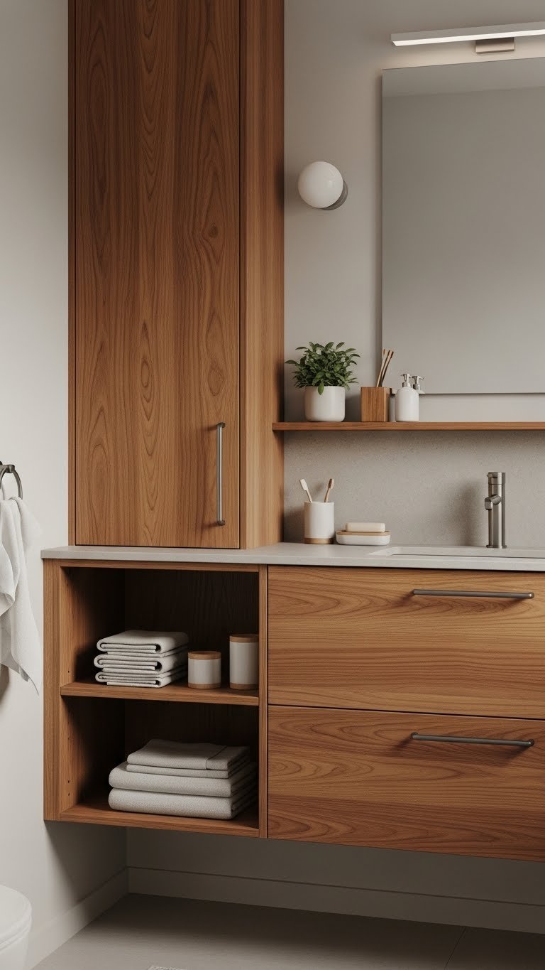 Choose pieces showing warm grain and simple hardware so you can move freely in a calm space. Pair a streamlined vanity with teak accents for spa-like texture, add open shelving to display essentials, and keep finishes muted to maintain light and visual openness.