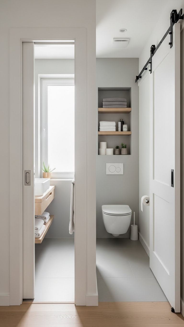 Pocket retrofit hides the door for minimal visual clutter; exposed barn hardware adds character if you want charm and movement. Prioritize smart space planning so your small bathroom feels open and liberating.