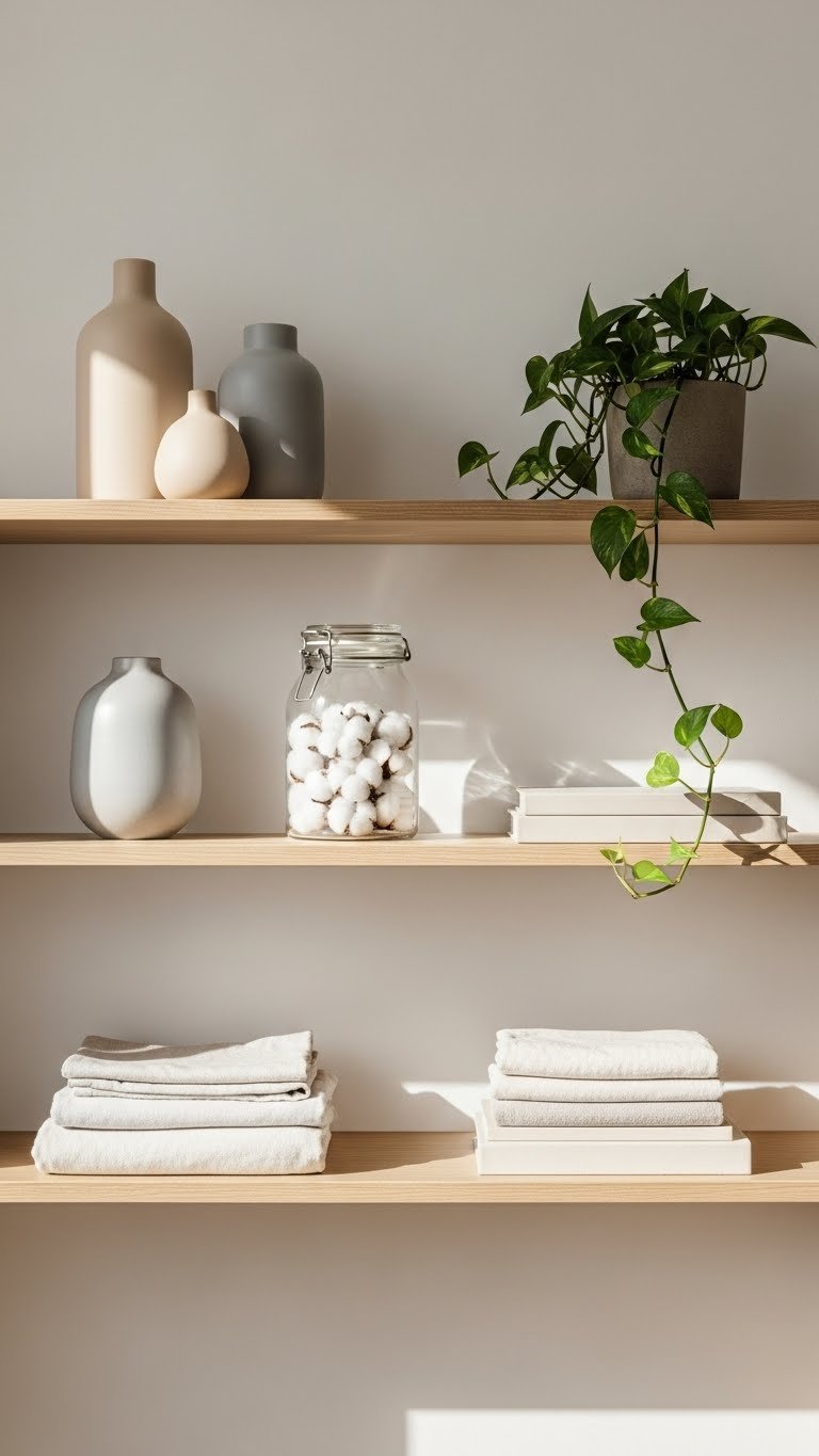 You’ll balance function and flair by mixing curated ceramics, a glass jar of cotton, and a small plant. Keep items intentional, use neutral tones, tidy stacked linen, and leave breathing room so the shelf feels deliberate, airy, and liberating.