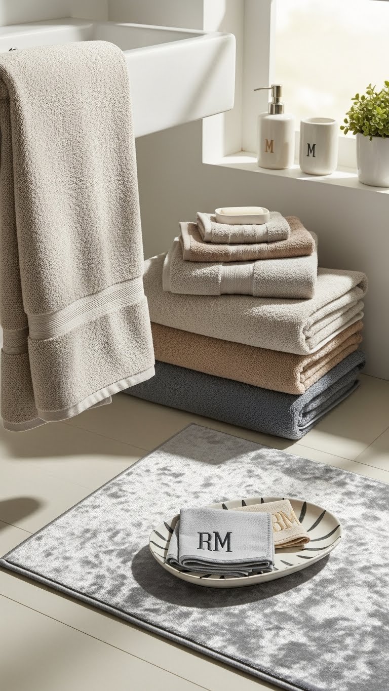 With a few plush towels and a small luxury rug, you’ll instantly elevate the feel of a compact bath without crowding it. Layer neutral towels, fold one with a visible edge, and place a velvet bathmats piece near the sink. Choose lightweight textures and stash monogrammed handkerchiefs in a tray for personality. This keeps the room airy, chic, and user-friendly.