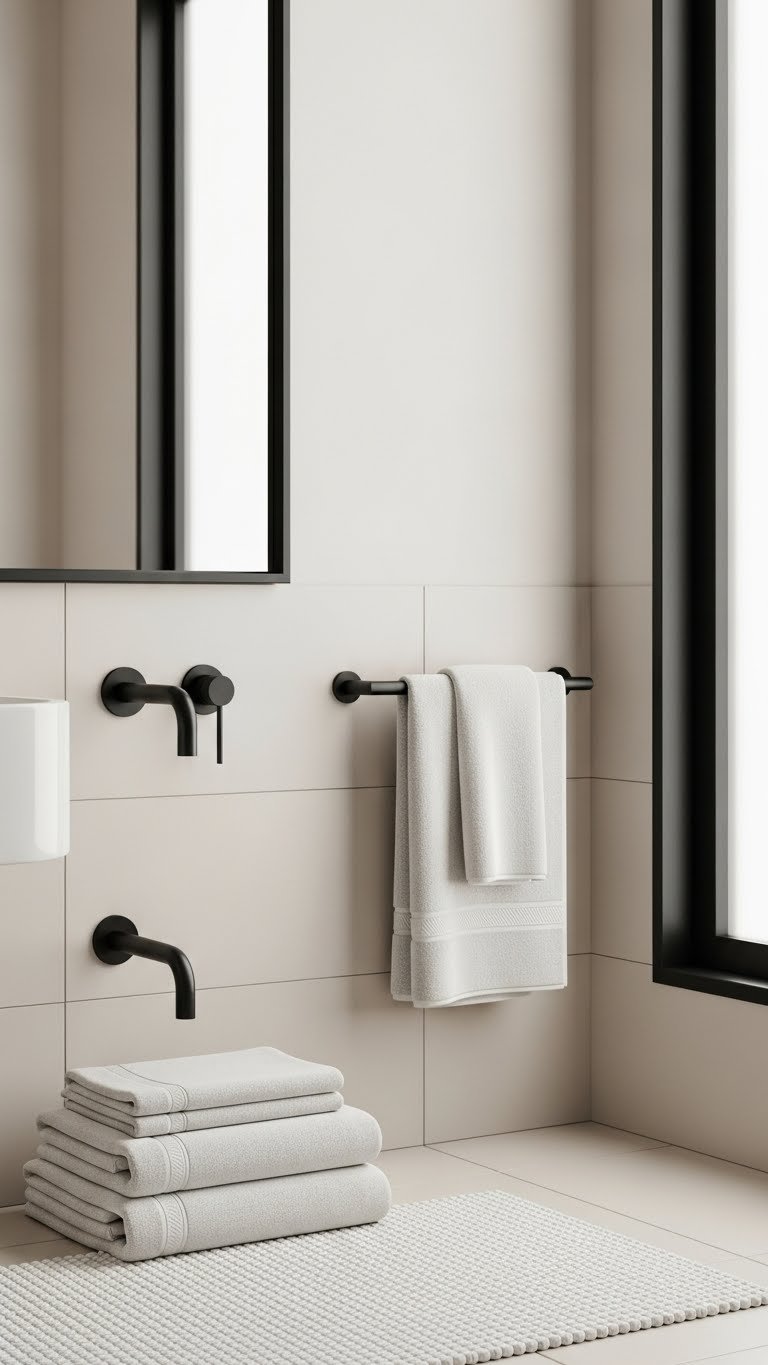 Use a single trim pop—mirror frame, towel bar, or window edge—to feel bold without clutter, keeping the space airy and free.