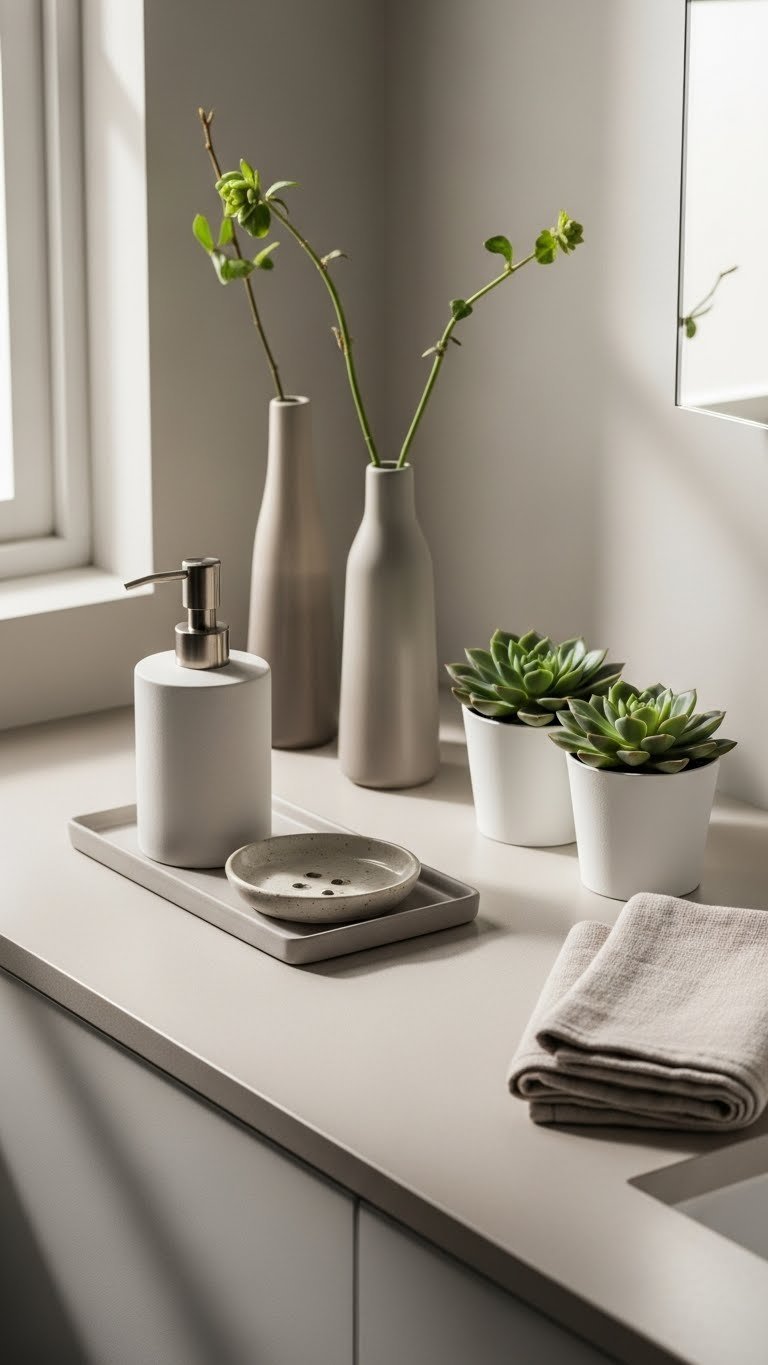 When you group a few carefully chosen accessories—think a simple tray, a minimalist soap pump, and a small ceramic dish—you create visual order without clutter.