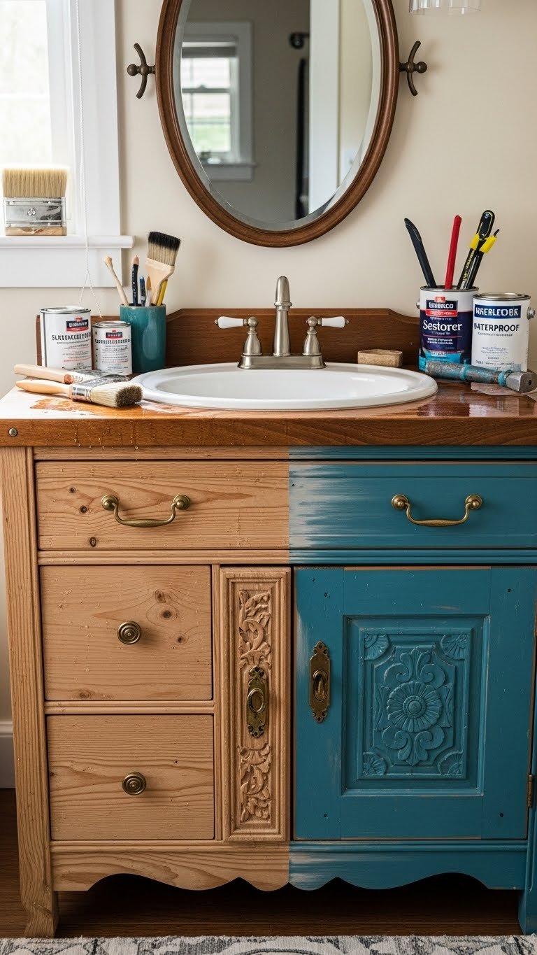 Repaint in a bold hue, swap hardware, and fit a salvaged door as a unique panel. Top with stone or butcher block, mount an antique mirror, and seal for waterproof durability—freedom to craft a luxe look affordably.