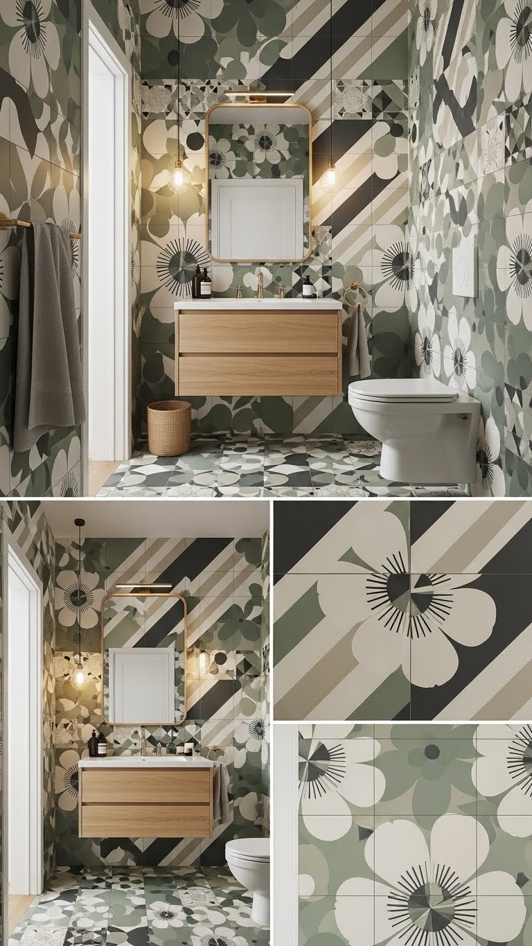 A bold, large-repeat pattern can make a small bathroom feel unexpectedly spacious by drawing the eye across a broader visual field—pick oversized florals, geometric tiles, or wide stripes so the motif reads at a distance rather than in fussy fragments.
