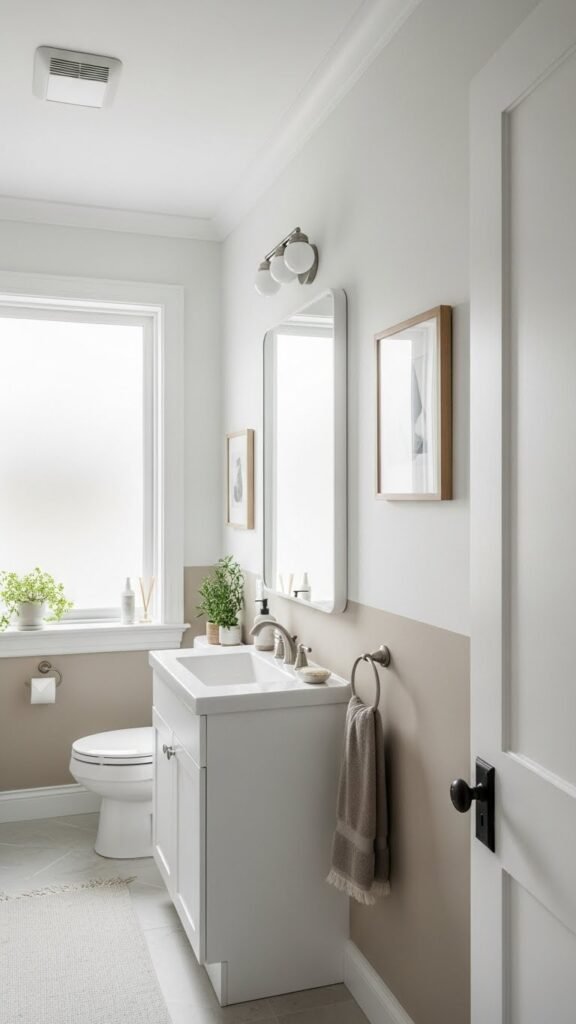 A soft, light neutral—think warm white, pale greige, or a muted sand—instantly makes a small bathroom feel wider and brighter; choose a matte or eggshell finish to minimize glare and hide imperfections.