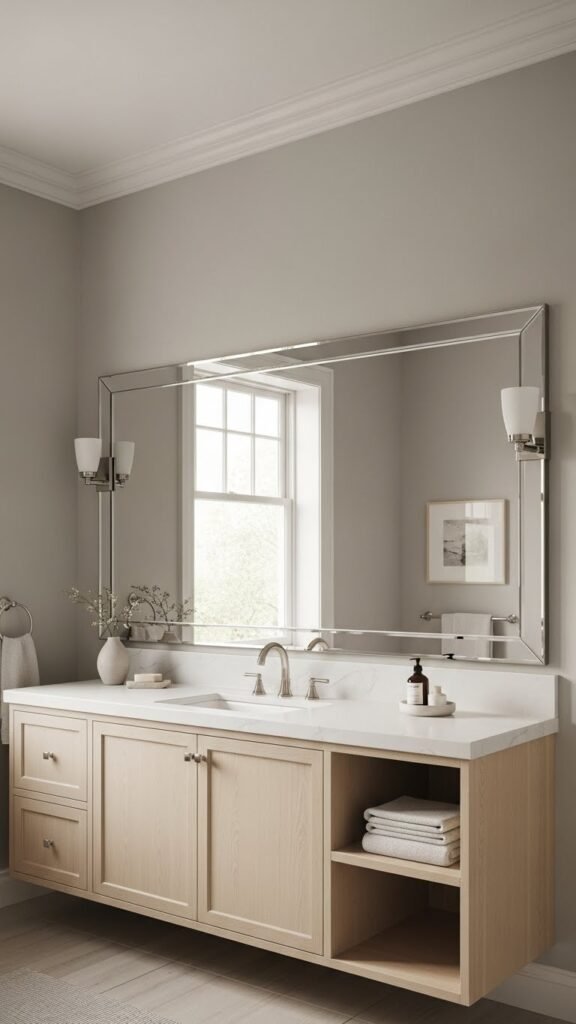 Pair that light neutral palette with a generously scaled mirror to instantly amplify depth and brightness; when you mount a wide, frameless mirror across the vanity wall it reflects daylight and the soft greige tones, making the room read as twice its width.