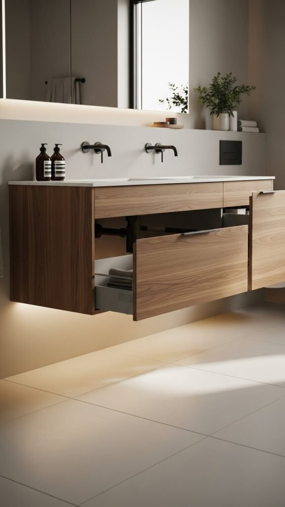 Suspended off the floor, a floating vanity instantly boosts your bathroom’s luxe feel while opening up visual and physical space—choose a streamlined cabinet in warm wood or matte lacquer, mount it at a comfortable height, and run plumbing concealed or neatly recessed to keep the look clean. Adjust wall mounting heights for ergonomics, add integrated lighting beneath or inside drawers, and keep hardware minimal for freedom.