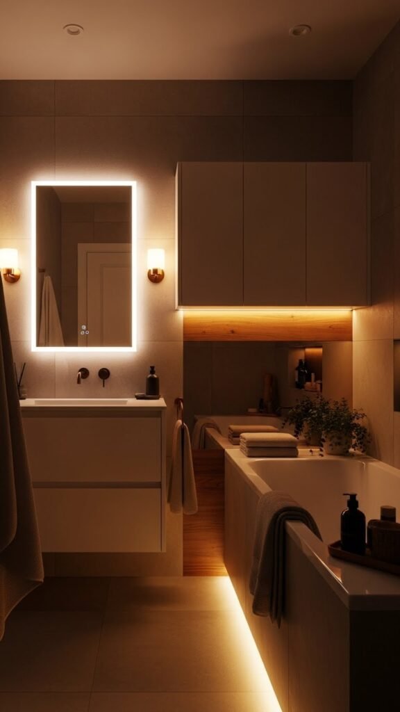 If you want your small bathroom to feel like a spa, add layered accent lighting that’s warm, dimmable, and placed to flatter texture and reflection. You’ll combine dimmable sconces beside the mirror, subtle LED cove lighting above cabinets, and a soft floor-level runner light.