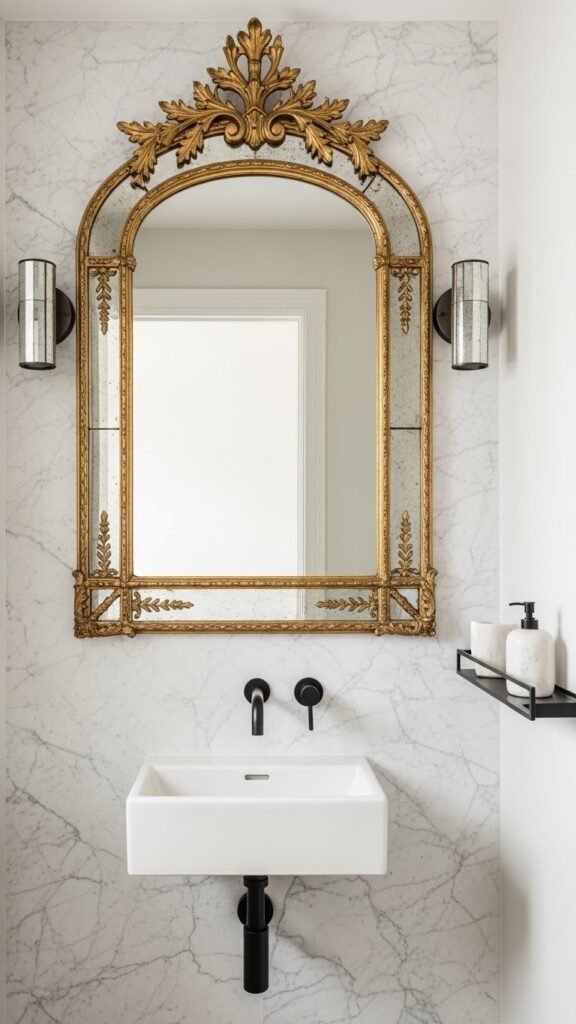 Pairing a luxe peel-and-stick marble backsplash with an ornate gilded mirror will instantly elevate your small bathroom from modern-chic to gallery-ready. Choose an antique gilt piece with a baroque frame to add dramatic contrast. Look for leaf tooling and subtle ornate motifs; hang it at eye level, secure with mirrored hardware, and balance with minimal fixtures so your space feels open and free.