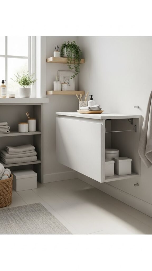 Built into the wall or mounted just above the floor, floating cabinets keep sightlines clear and make a small bathroom feel airier while giving you usable storage.