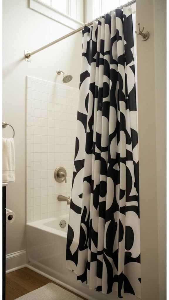 Elevate with an elongated rod, choose a flowing fabric or a bold patterned liner, and mount brackets into studs. This instantly expands proportions and lets your tiny bathroom breathe freely.