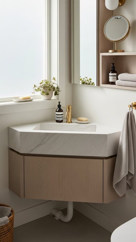 In a tight footprint, tucking a sink into the corner frees up floor and visual space so you can reroute traffic and add storage where you need it most. Choose a compact basin with corner mounted storage beneath, keep lines clean and materials luxe, and plan angled plumbing to fit without bulk. You’ll gain movement, concealed utility, and an airy, liberated feel.