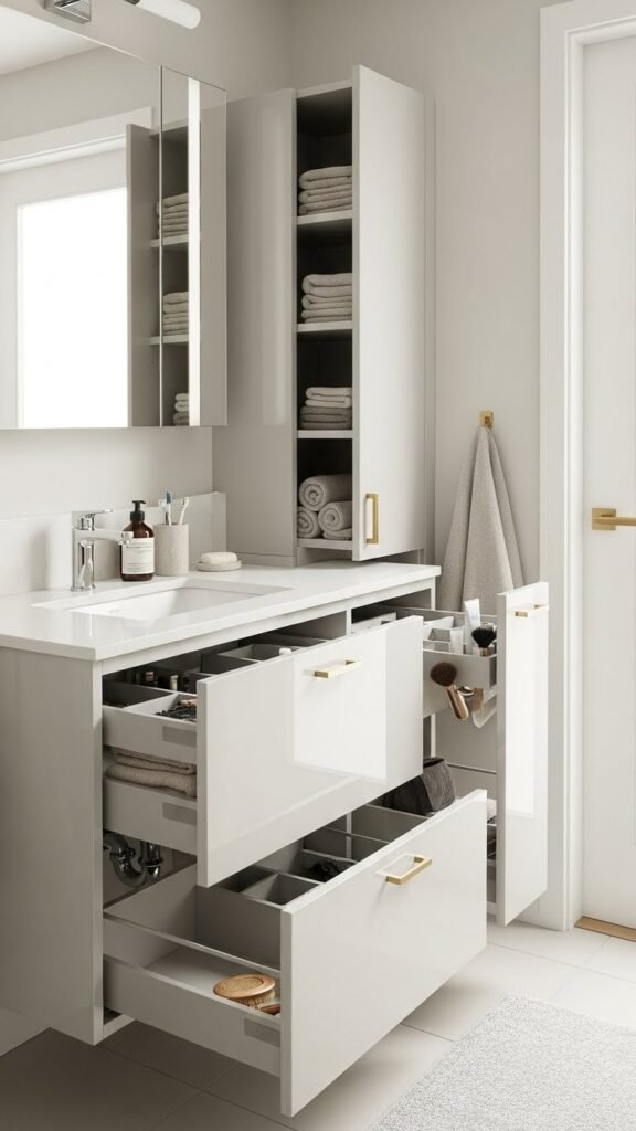 Slip a custom narrow vanity into tight bathrooms to reclaim storage without crowding the room: choose a slim-profile cabinet tailored to your plumbing run, mount drawers on soft-close slides, and prioritize vertical organizers for toiletries and towels. You’ll gain freedom with hidden compartments, pull out organizers for grooming tools, minimalist brass hardware, and a light-reflecting finish to keep the space airy and luxe.