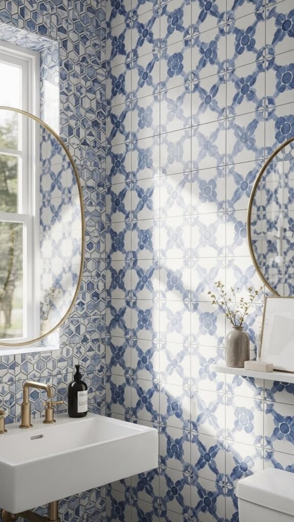 Brighten and anchor a small bath with blue-and-white allover tile that plays up pattern without overwhelming the space: pick a scale and motif that complement your fixtures—small geometric tiles for a modern look, hand-painted arabesques for a more artisanal feel—and run them on a single plane (shower surround or full wall) to create a strong focal point.