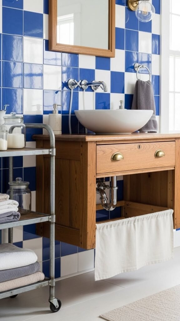 After anchoring a wall with bold blue-and-white tile, consider pairing that focal plane with a repurposed piece as your vanity to add warmth and character.