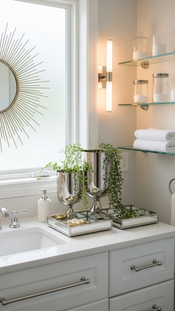 Lightplay can transform a small bathroom: you’ll use mirrors, metallic finishes, and glass accents to bounce natural and artificial light around the room, making it feel larger and airier. Place mirrored trays on counters to reflect vanity light, hang a slim sunburst mirror, and add metallic planters with trailing greens. Choose clear glass shelves and polished hardware to amplify brightness and freedom.