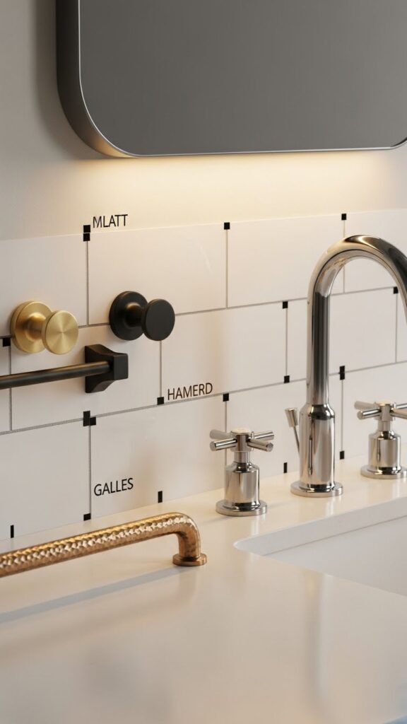 Once you’ve given walls depth with spaced peel-and-stick tiles and faux grout, let the hardware carry the room like jewelry: faucets, pulls, and towel bars should feel intentional, not afterthoughts. Choose Brass knobs for warmth, Matte black for contrast, Polished chrome for brightness, or Hammered bronze for texture. Mix one finish, keep lines simple, and swap pieces for an instant luxe upgrade.