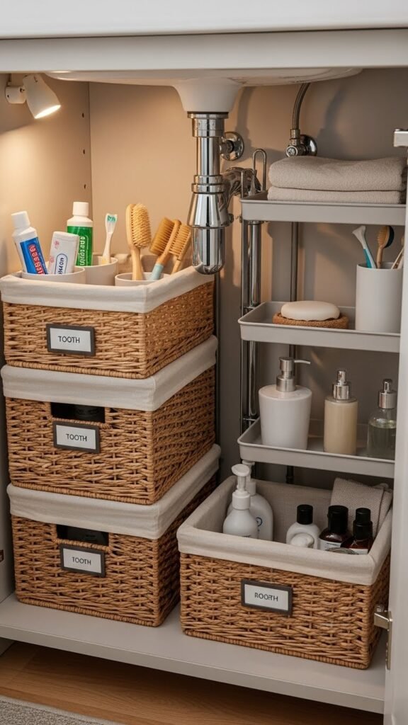 Tame under‑sink chaos with a few well‑chosen baskets that make everything visible and reachable.