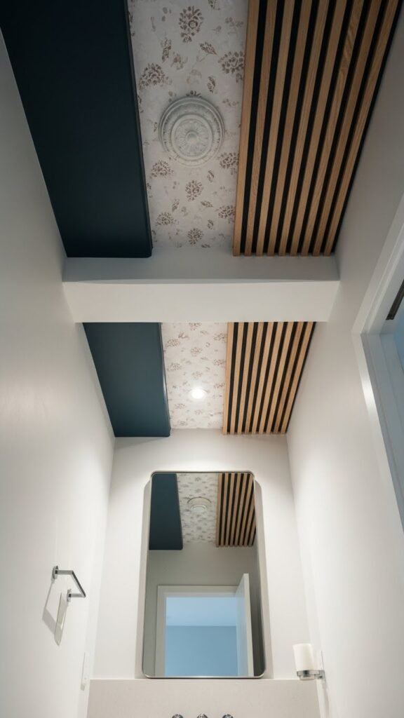 When you lift your gaze, a treated ceiling instantly redirects attention upward and makes a small bathroom feel taller and more deliberate; choose a bold paint color, subtle wallpaper, or a wood slat treatment to create that vertical pull. You can add painted beams for contrast or small ornate medallions around a light. Keep finishes minimal, pick one focal hue, and install with clean lines.