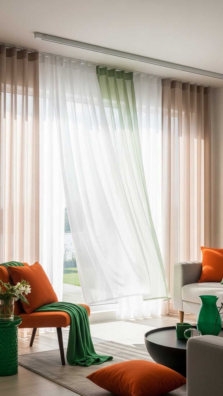 Those vivid accents deserve a light, airy stage—swap heavy drapes for sheer curtains to keep rooms feeling open and let those burnt orange and emerald pops breathe. You’ll choose sheer panels that filter light, create breezy silhouettes, and free your space from weight. Install floor-to-ceiling tracks, play with layered translucency, and enjoy effortless movement and a liberated, sunlit home vibe.