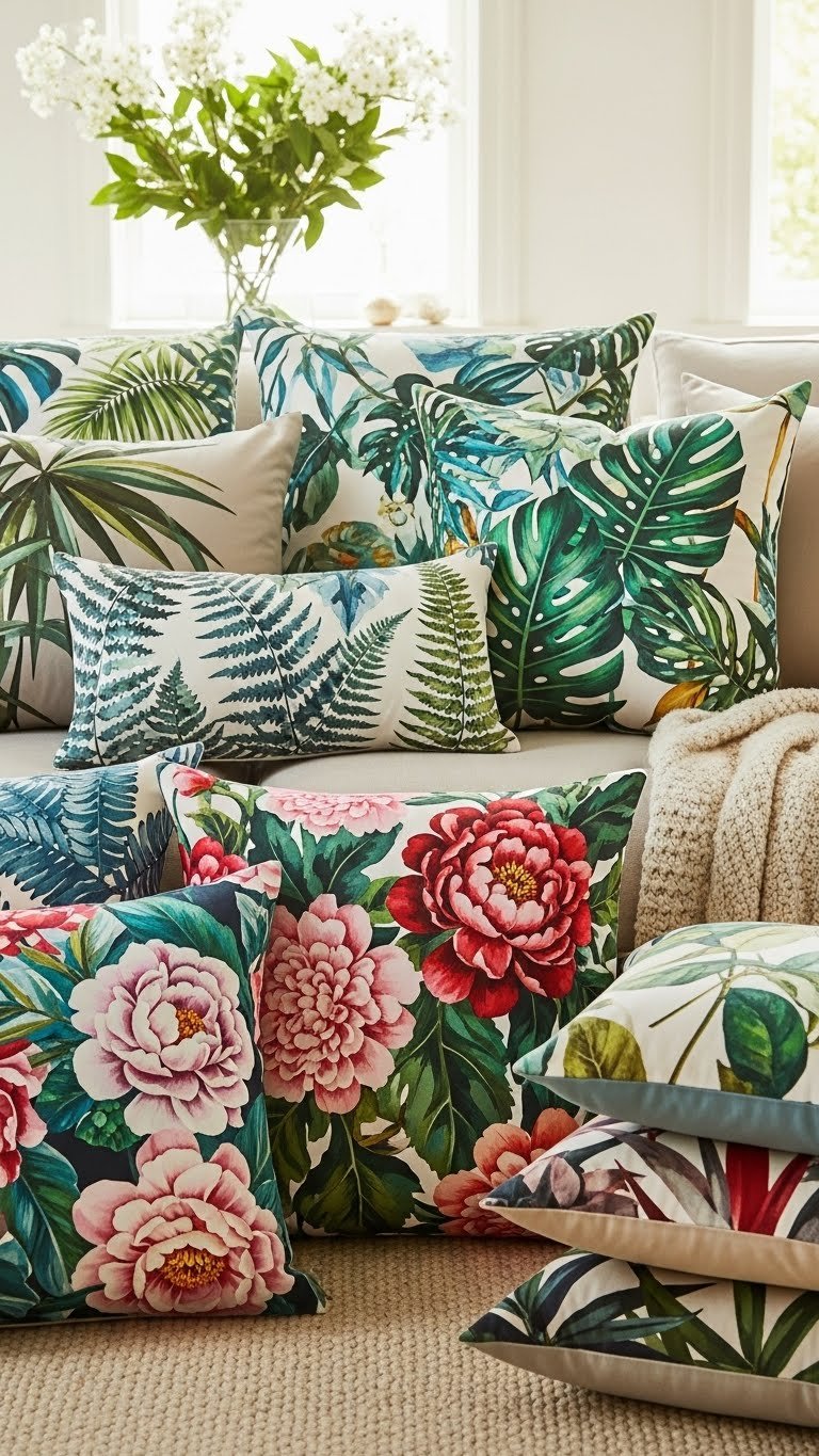 Brighten your sofa by swapping plain cushions for throw pillows in bold botanical prints—think oversized palms, painterly ferns, and blooming peonies in saturated hues.