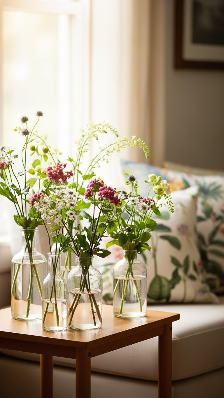 After you swap in botanical pillows, bring the outdoors indoors with a handful of fresh-cut blooms in simple glass vases—it’s the quickest way to add scent, movement, and a lived-in polish. You’ll echo that effortless, free-spirited vibe by scattering a bud vase or two, trimming seasonal stems to varying lengths, and letting loose arrangements feel informal, personal, and utterly modern.