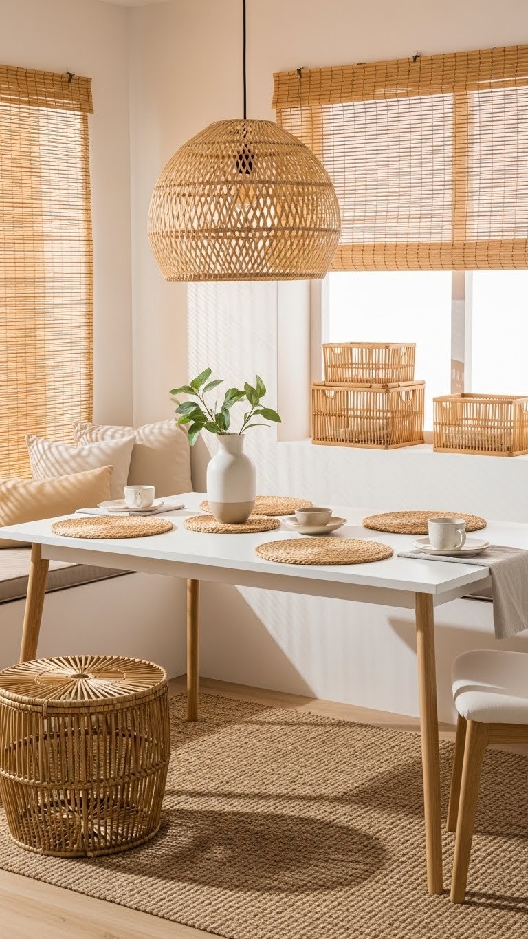 You’ll love rattan lighting hung over a dining nook and jute placemats on an uncluttered table. Add bamboo baskets for storage to keep spaces airy and free.