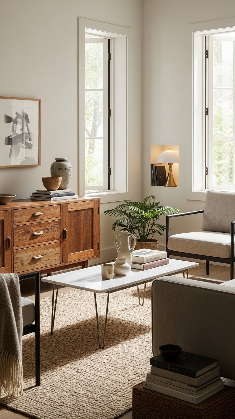 Bring together a weathered mid-century credenza and a sleek marble coffee table to create a layered, lived-in look that still feels current. You’ll mix antique hardware with clean lines and modern upholstery to balance history and minimalism. Edit boldly: keep one vintage focal piece, pair with streamlined seating, and let open windows and lighted nooks amplify a free, intentional vibe.