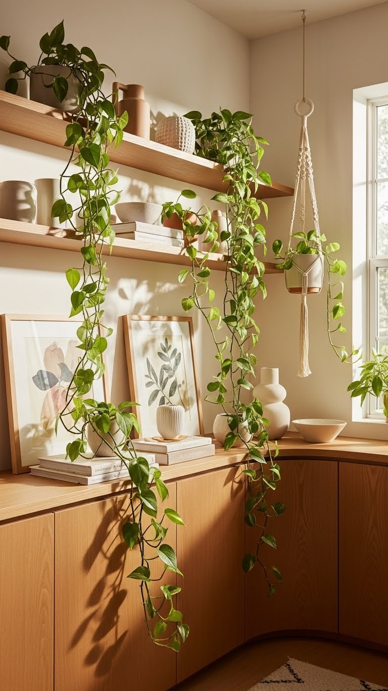 You’ll invite effortless growth with hanging pothos in sunlit corners, cascading over books and art.