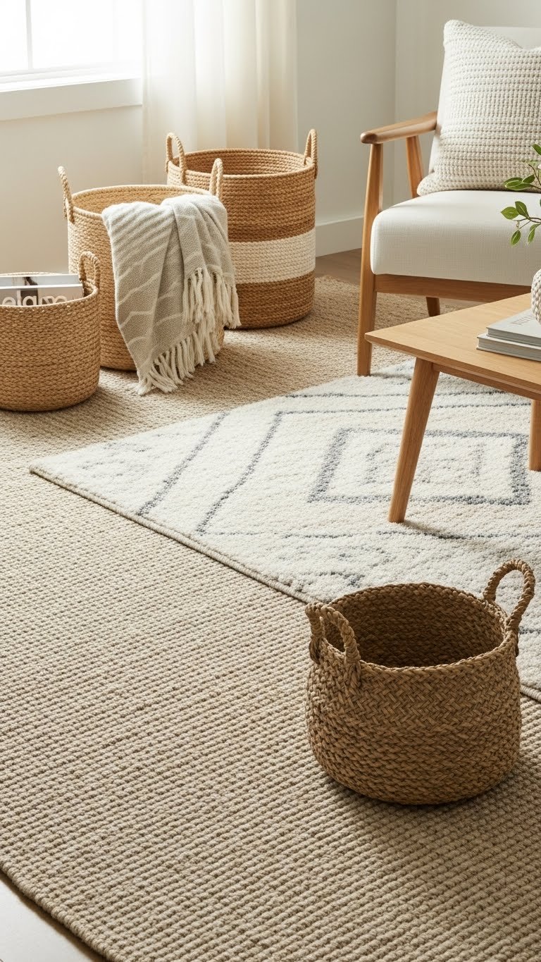 Layer Textured Rugs and Woven Baskets
