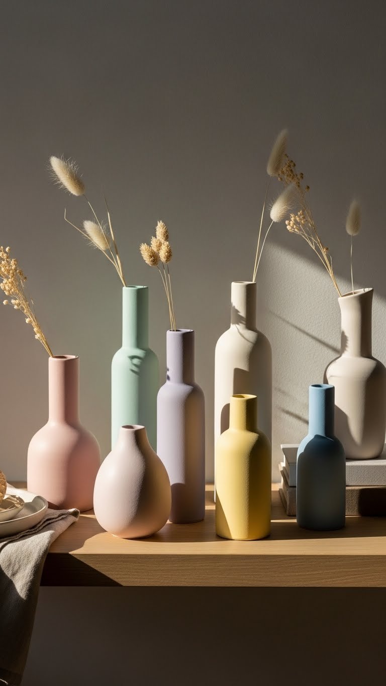 Bring together a small group of pastel ceramic vases to create a soft, sculptural statement that brightens any shelf or table. Choose matte ceramics in varied heights and shapes; arrange them as a pastel grouping that feels effortless. You’ll mix single stems or dried grasses, leave breathing space, and shift pieces seasonally. The result feels liberated, modern, and quietly luxe.