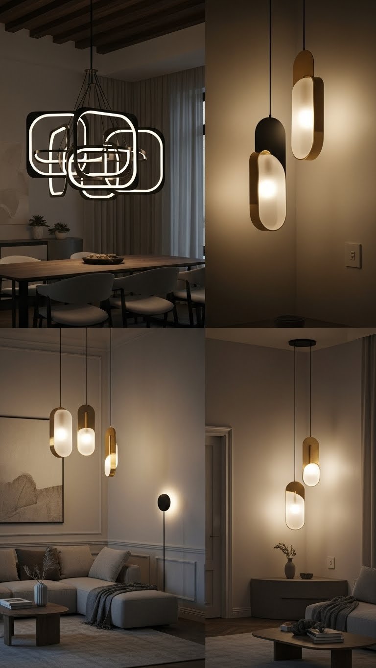 Swap ordinary fixtures for sculptural statements that redefine a room’s mood and scale. Choose sculptural pendants to punctuate corners or a dining nook, and let statement chandeliers elevate ceilings and attitude. You’ll mix materials and negative space, favoring bold silhouettes that feel liberating. Install dimmers to control drama — it’s about freedom, mood, and effortless, modern impact.
