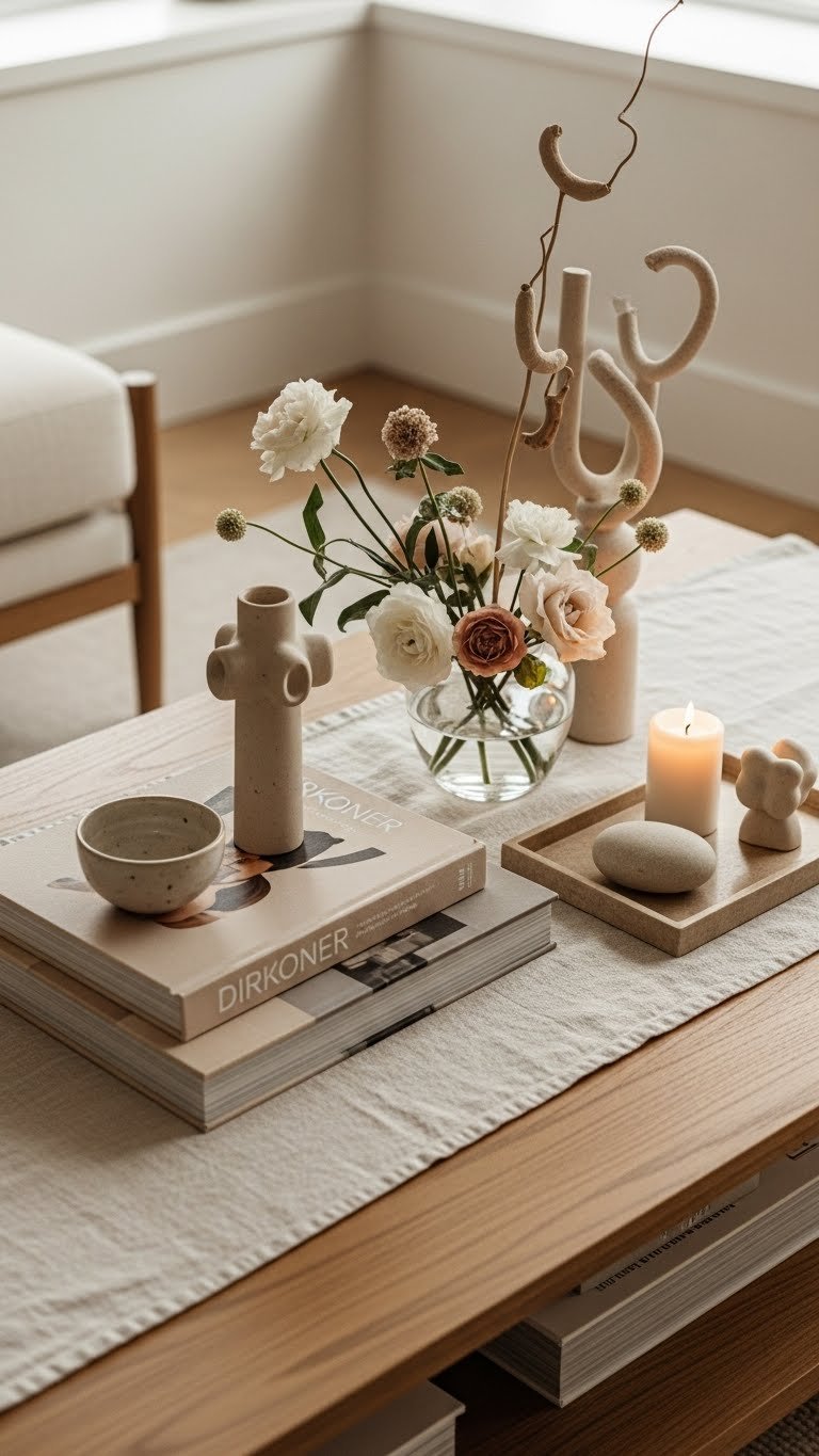 Curate a coffee table vignette that feels intentional, not cluttered: start with one or two oversized art or design books as your base, add a low vase of fresh blooms or sculptural dried stems for height, and finish with a small tray holding a candle and a couple of tactile trinkets to anchor the arrangement. Pair stacked volumes with ceramic accents, a linen runner, and one statement object to keep it effortless.