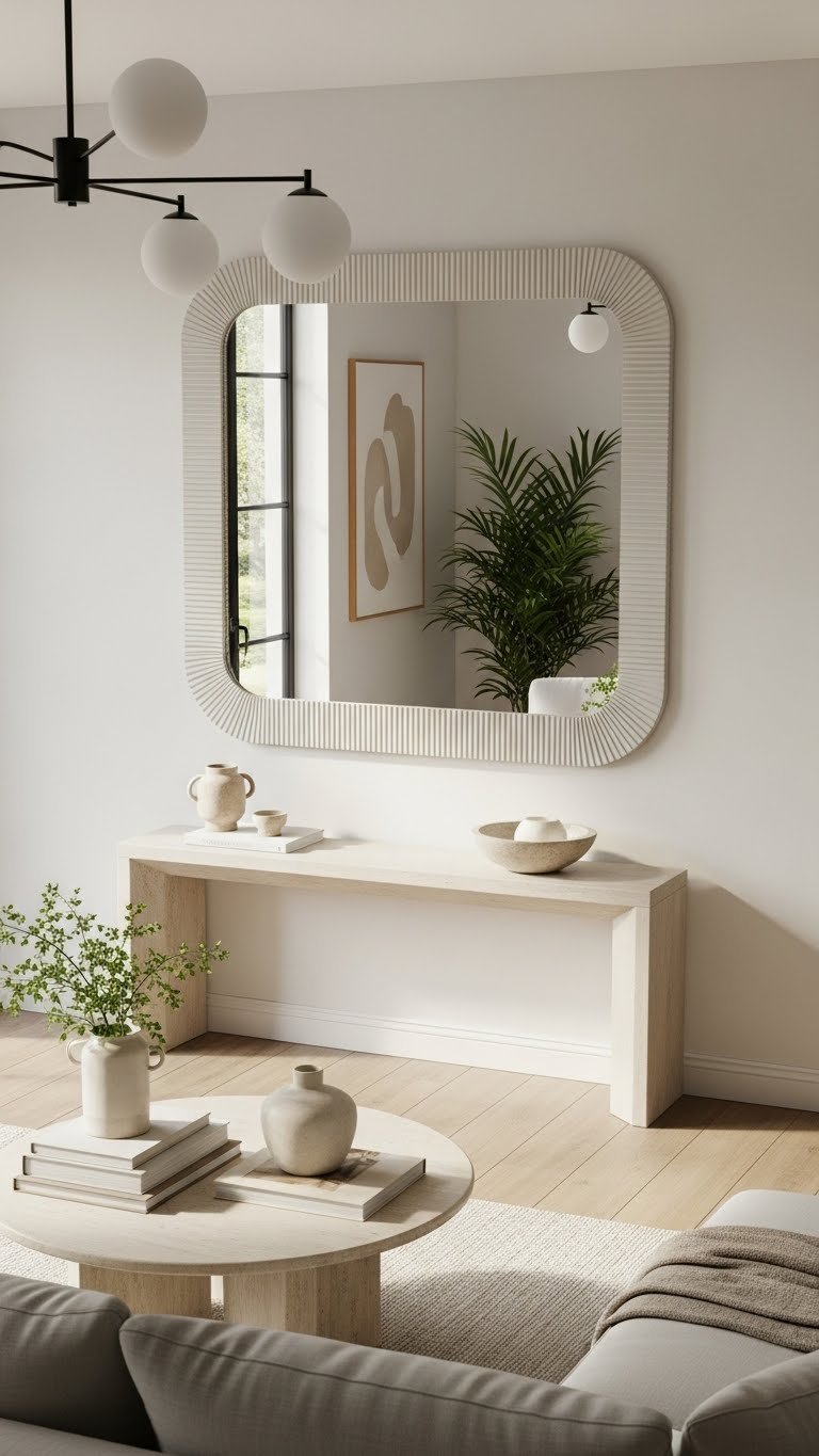After you’ve perfected that coffee table vignette, extend the same careful editing to your walls with a fluted or rounded mirror to catch light and soften hard edges.