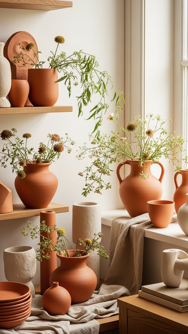 Bring in terracotta pots and natural clay accents to ground the soft florals with warm, earthy texture. You’ll mix terracotta planters across shelves and windowsills, pairing them with pared-back clay sculptures for soulful, tactile moments.