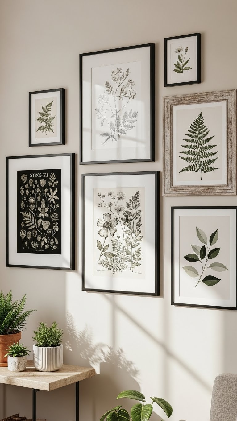 Start by gathering a mix of botanical prints in varied scales and frames so you can play with contrast and rhythm across the wall.
