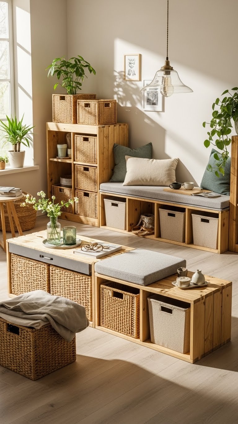 When you choose multifunctional storage made from sustainable materials, you’re combining form and conscience—pieces that hide clutter, double as seating or surfaces, and keep your footprint small. Embrace modular baskets and hemp bins to customize zones, stow gear, and create airy, flexible rooms. You’ll move freely, edit quickly, and enjoy a streamlined spring aesthetic that’s ethical, modern, and effortlessly adaptable.
