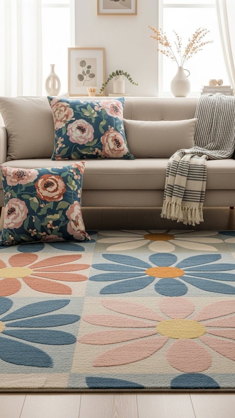 You’ll balance scale—large geometric florals on a rug, medium pillows, slim striped overlays on throws—so rooms feel layered but airy.