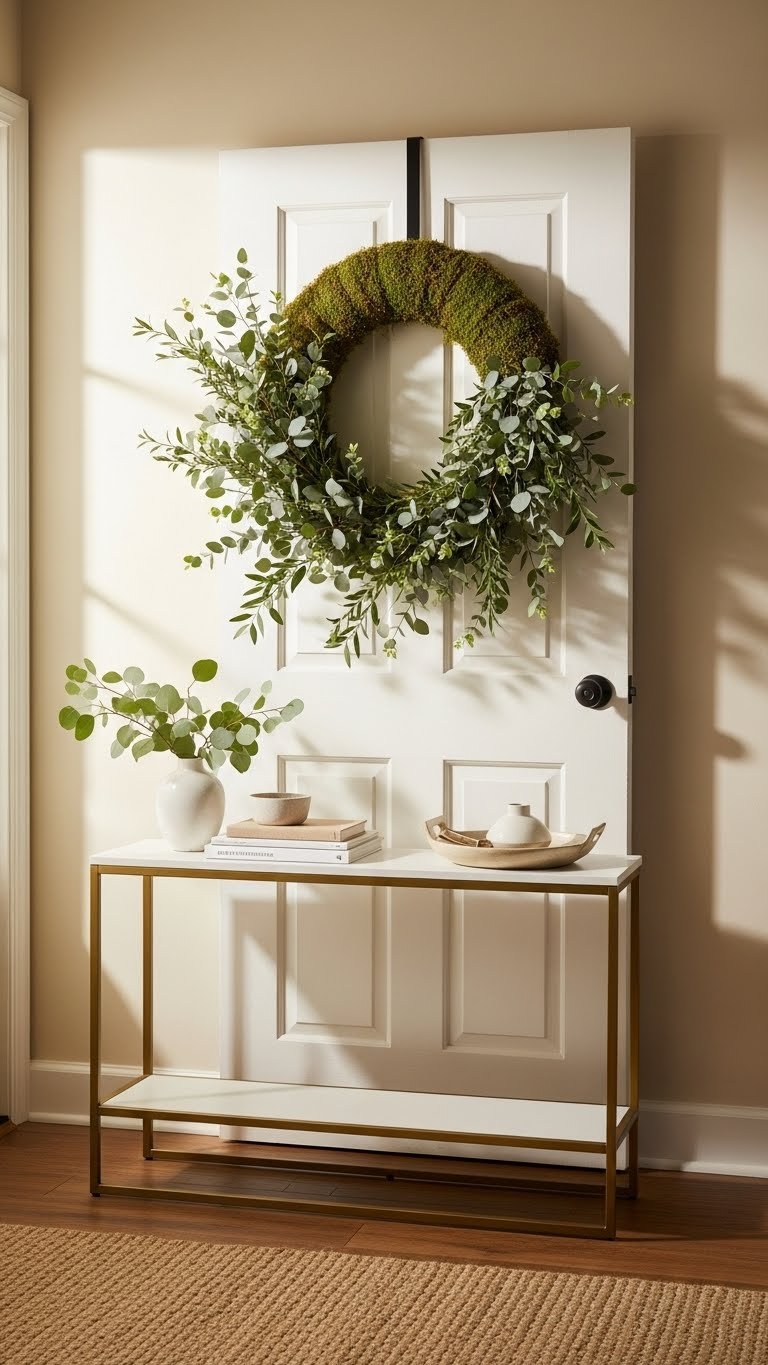 After you’ve layered patterns in the main room, bring that curated energy into the entryway with a statement wreath of fresh or faux greenery.