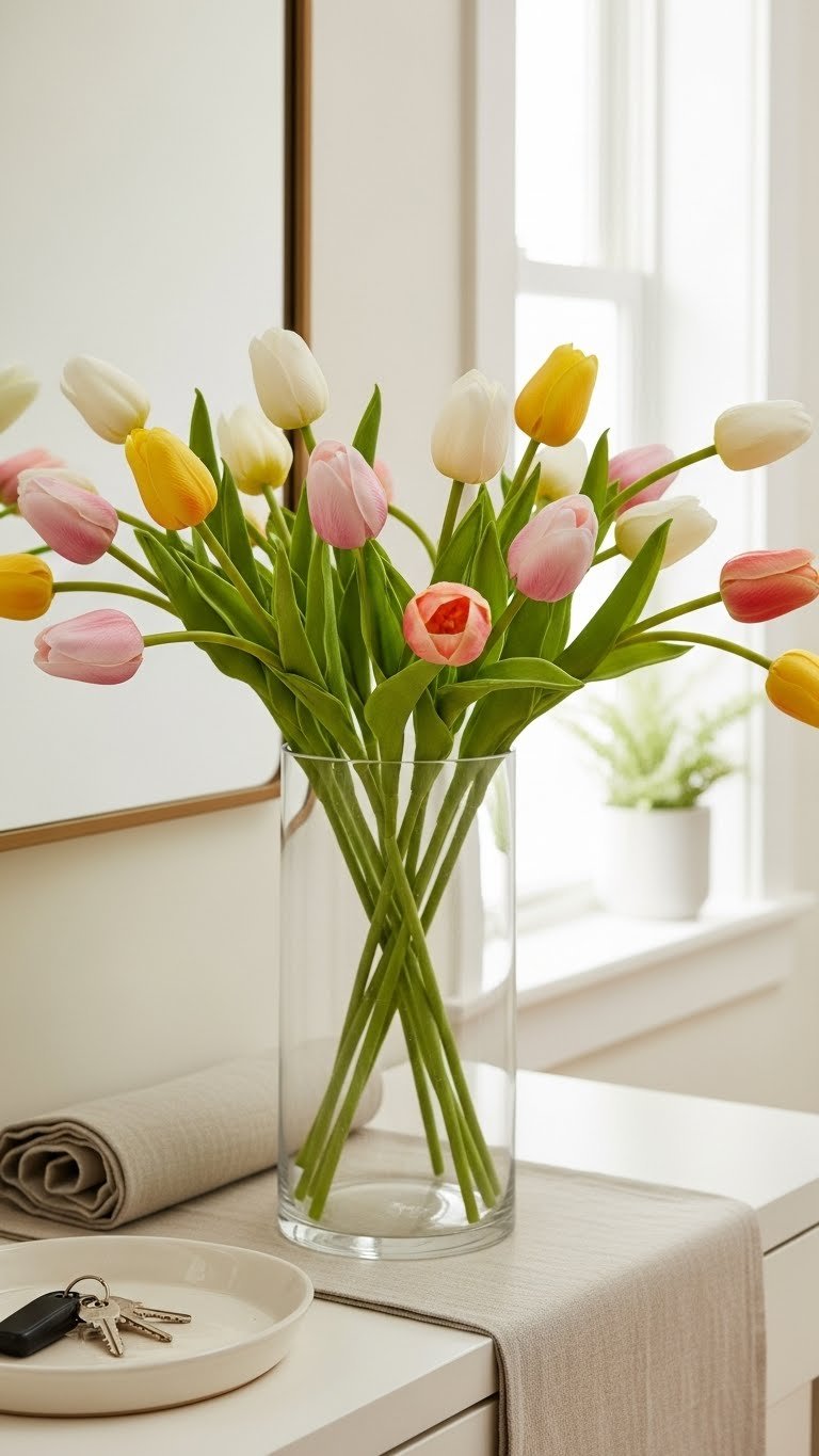 Bring in real-feel tulips or seasonal faux blooms to keep the entryway feeling fresh without the maintenance—these lifelike stems give you the color and texture of spring but won’t wilt between busy days. Choose silk tulips for ultra-realism or opt for scented tulips that hint at nature. Arrange casually in a tall vase, switch colors seasonally, and enjoy effortless, freeing style.