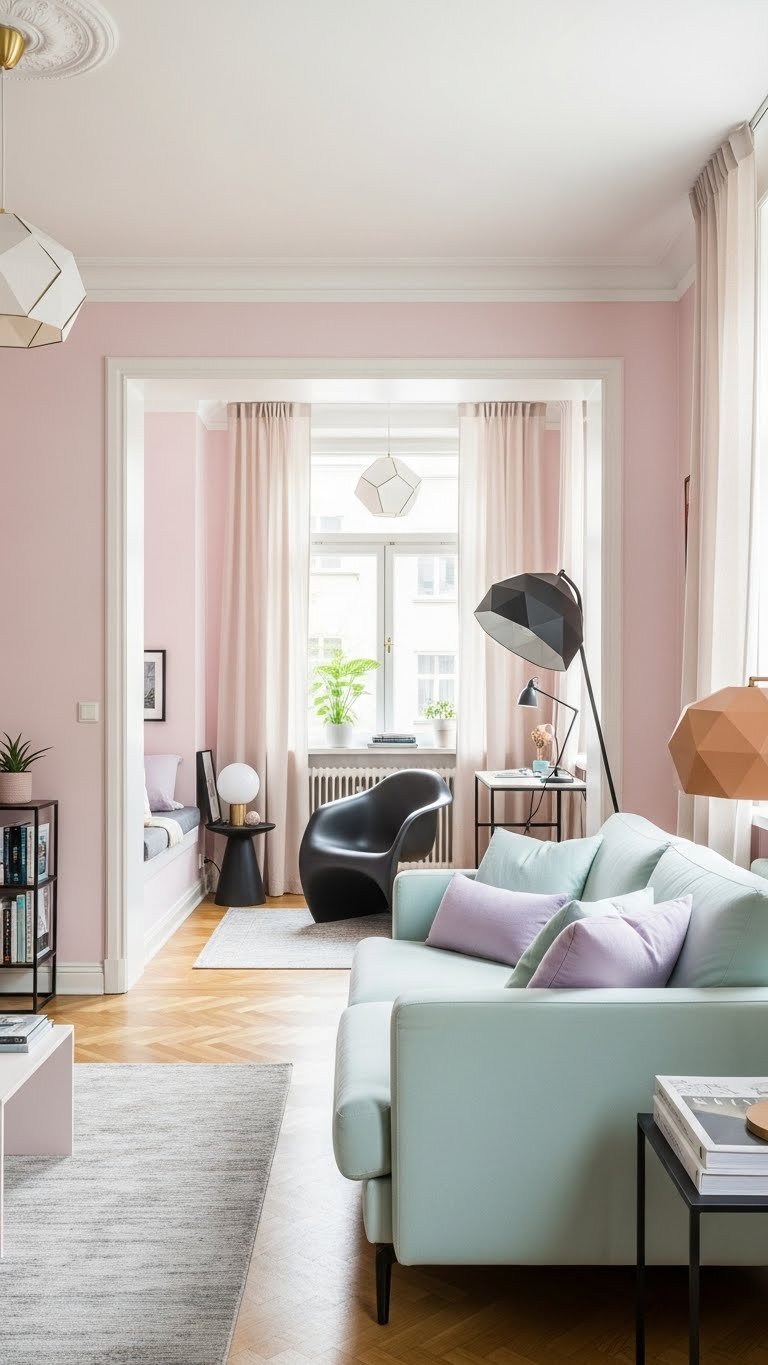When you introduce soft pastels, your room instantly feels lighter and more inviting; pair them with a bold modern accent piece to keep the look fresh and grounded. You’ll use pastel contrasts to define zones without heaviness, trusting clean lines and selective color pops. Focus on smart accent curation—one sculptural chair or lamp—and enjoy a liberated, uncluttered space that breathes.