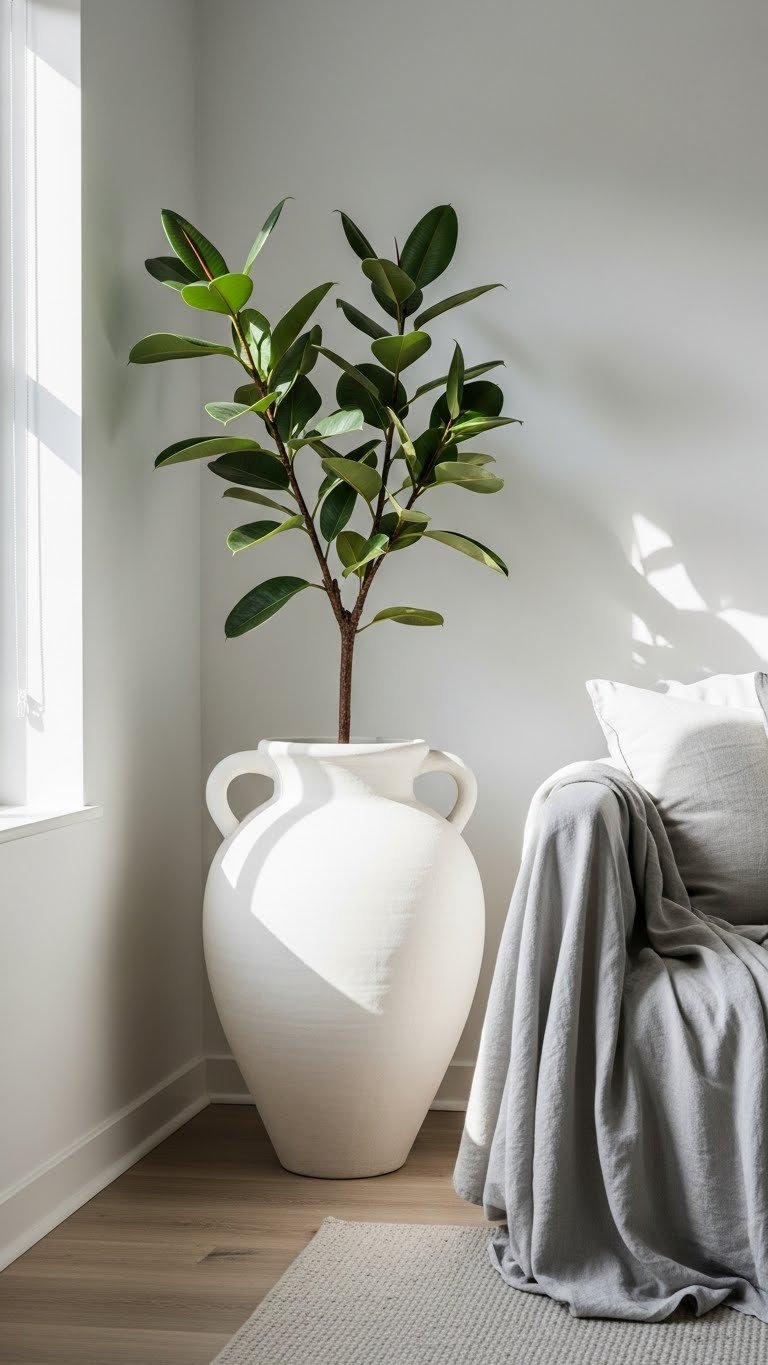 Pair those airy linen throws with a bold sculptural urn to anchor the room and bring living texture to the corner. Place a tall, architectural focalpoint like a fiddle leaf or rubber plant to carve space and invite movement. You’ll enjoy the clean botanical silhouette against light walls; choose a matte finish urn for contrast and easy styling that feels freeing and intentional.