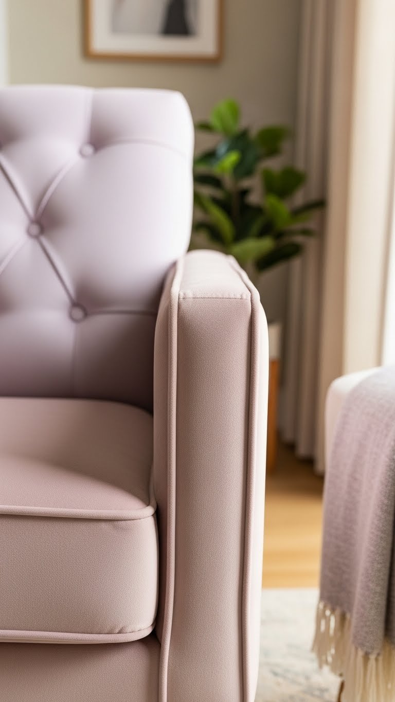 If you’re ready to give the room a soft focal point, reupholstering an accent chair in blush or lavender instantly lifts the palette without overwhelming it. Choose durable fabric, add Blush piping for crisp edges and subtle contrast, and consider Lavender tufting for texture that feels both refined and relaxed. You’ll create a liberated, breathable spot that invites lounging and personal expression.