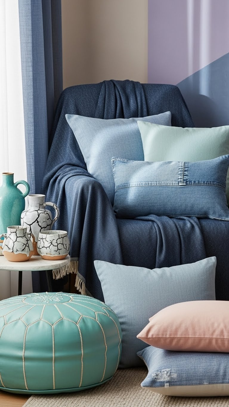 After softening the room with blush and lavender, bring in cool blue textiles to carve out a calm corner that balances warmth and airiness. Drape a cool indigo throw over a chair, layer faded chambray cushions, and add a muted aqua pouf. Choose ceramics with cracked glaze for a lived-in, free-spirited feel. Let the corner invite quiet and easy lounging.