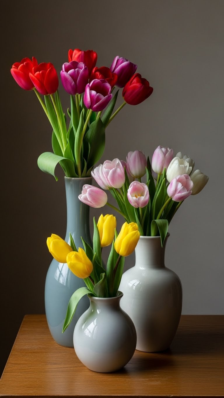 Cluster tulips in a trio of vases at varying heights to create an easy, artful centerpiece that feels spontaneous yet curated. You’ll use height variation to guide the eye, trim stems with confident stem trimming for clean lines, and arrange blooms for floral balance.
